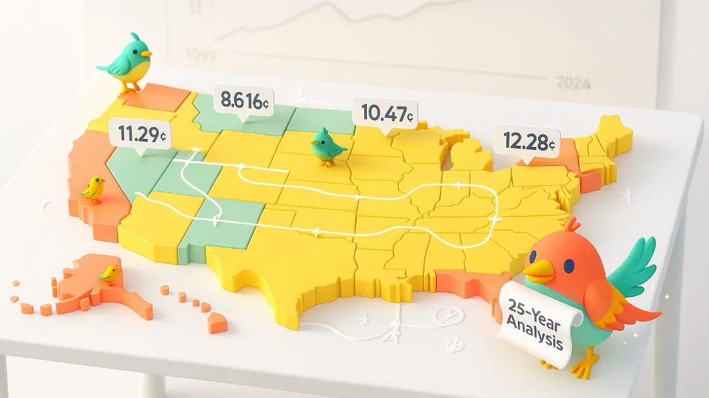 To understand these dramatic changes, we compiled comprehensive pricing data from every state, tracking the evolution of residential electricity rates from 1999 through 2025. This wasn't just about collecting numbers – it was about understanding the story behind each state's journey through changing energy landscapes, policy shifts, and technological advances.